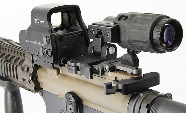 Следует учитывать то, что линзы коллиматорного прицела, вне зависимости от типа, не имеют увеличения, поэтому бывает целесообразно использовать коллиматор в паре с магнификатором. Магнификатор представляет собой модификацию оптического прицела без прицельной сетки, роль которой выполняет прицельная марка коллиматора. Очевидно, что для взаимодействия этих двух прицельных устройств их нужно размещать на одной линии (оси). Особенностью магнификаторов является их довольно ограниченная кратность, поэтому значительно увеличить дальность прицела не представляется возможным, хотя, как уже отмечалось, коллиматорные системы прицеливания могут быть эффективны лишь на средних дистанциях и для стрельбы на значительных расстояниях до объекта прицеливания применяются совсем другие прицельные системы.